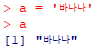 # a라는 변수에 '바나나'를 담아라. a = '바나나' # a 변수를 알려줘. a # a의 데이터 타입을 알려줘. typeof(a)